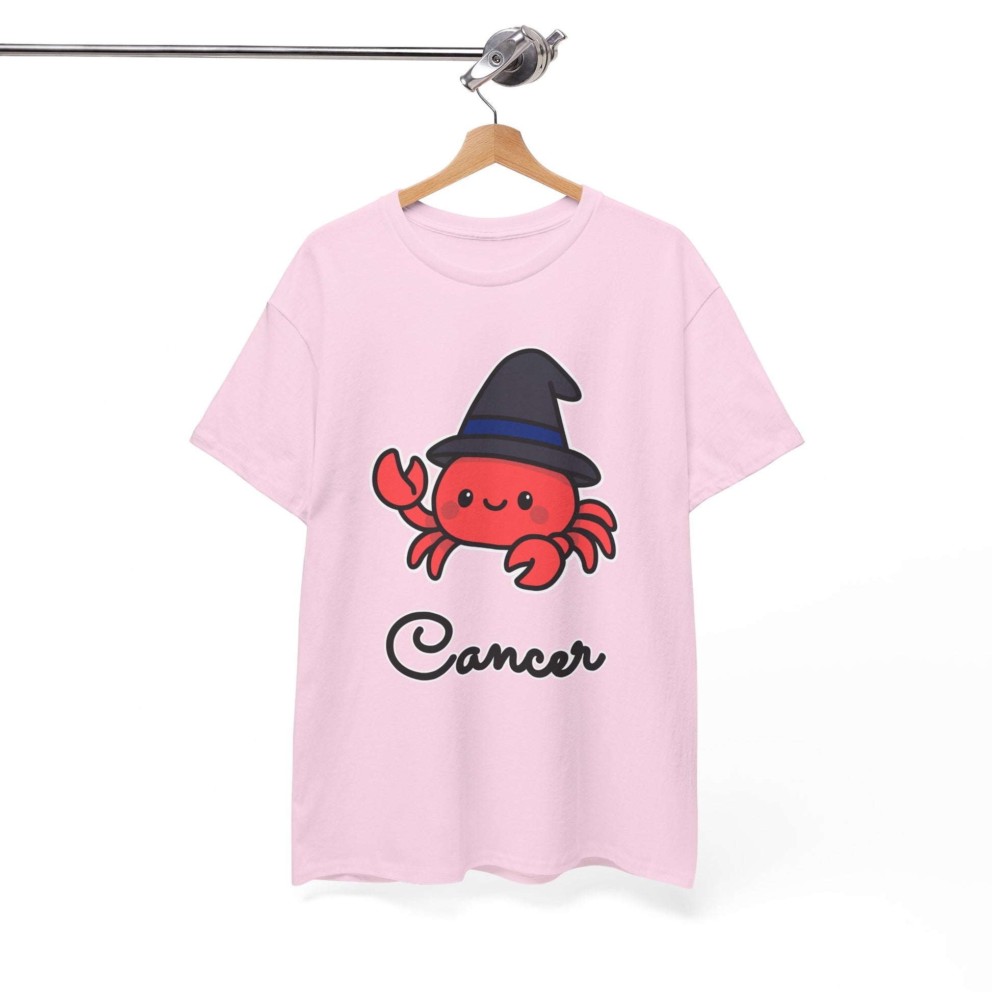 Bring your Cancer energy to life with this playful astrology graphic tee! Featuring an adorable cartoon crab rocking a witch's hat and the bold caption Cancer, this shirt blends cosmic charm with a touch of magic.